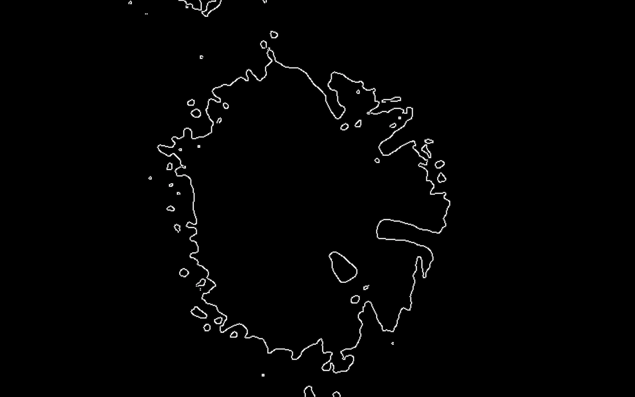 将Canny操作符从处理过程中删除。它会给你一个边缘图像从你的斑点。一旦您使用contourFinder处理Canny图像,它将把边缘段视为对象。你最大的轮廓将是最长的边缘段。如果你放大你的Canny图像,你会发现在你当前的结果结束的地方有一些空白。