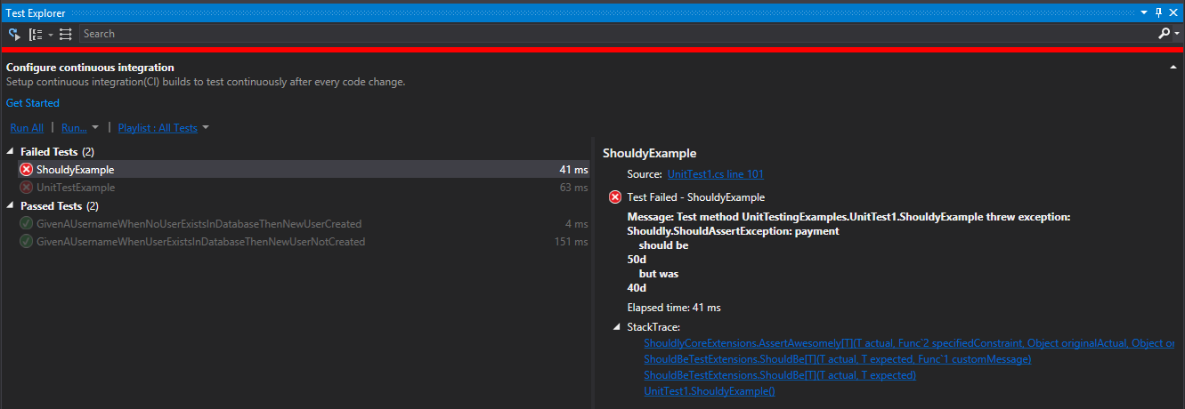 但是,当它运行我的测试时,断言会向ShouldAssertException抛出正确的断言不匹配描述,而不是在Visual 2015中显示测试资源管理器中的结果。