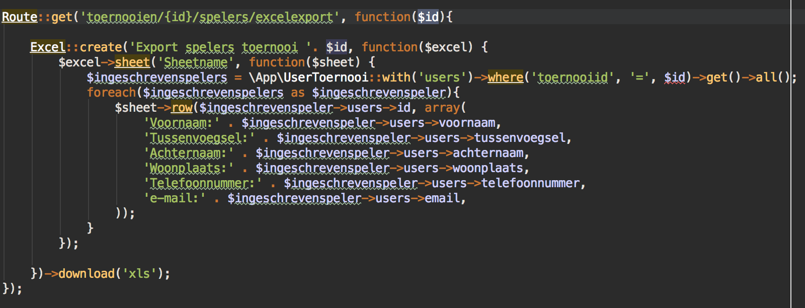 Route::get('toernooien/{id}/spelers/excelexport', function($id){