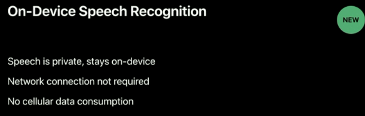 根据https://developer.apple.com/videos/play/wwdc2019/256/ (镜像),SFSpeechRecognizer所做的语音识别可以在设备上执行(即,不与服务器连接)用于语音识别: