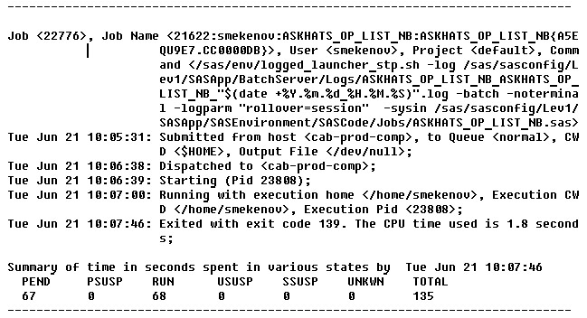 我在执行SAS批处理命令时遇到了错误。批处理命令由执行。bhist命令显示如下:
