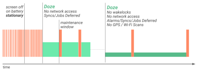 如果用户在一段时间内将设备断开并保持不动,则该设备将进入Doze模式。在Doze模式下,系统试图通过限制应用程序访问网络和CPU密集型服务来节省电池。