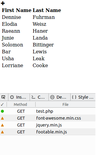 我正在尝试使用FooTable作为独立版本。我复制/粘贴了这示例的代码,包括jQuery.js、fontawesome.css和footable js/css。