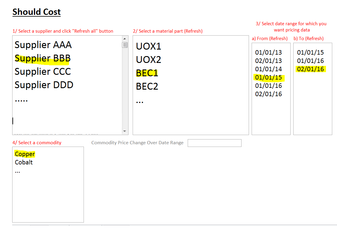 假设用户在第一个列表框中选择供应者BBB (然后单击刷新以便填充第二个列表框),然后选择部件BEC1 (刷新)、日期范围(01/01/15-02/01/16) (刷新),然后选择商品铜(刷新)。然后,我希望非红色列表框显示铜价从01/01/15 - 02/01/16之间的变化。