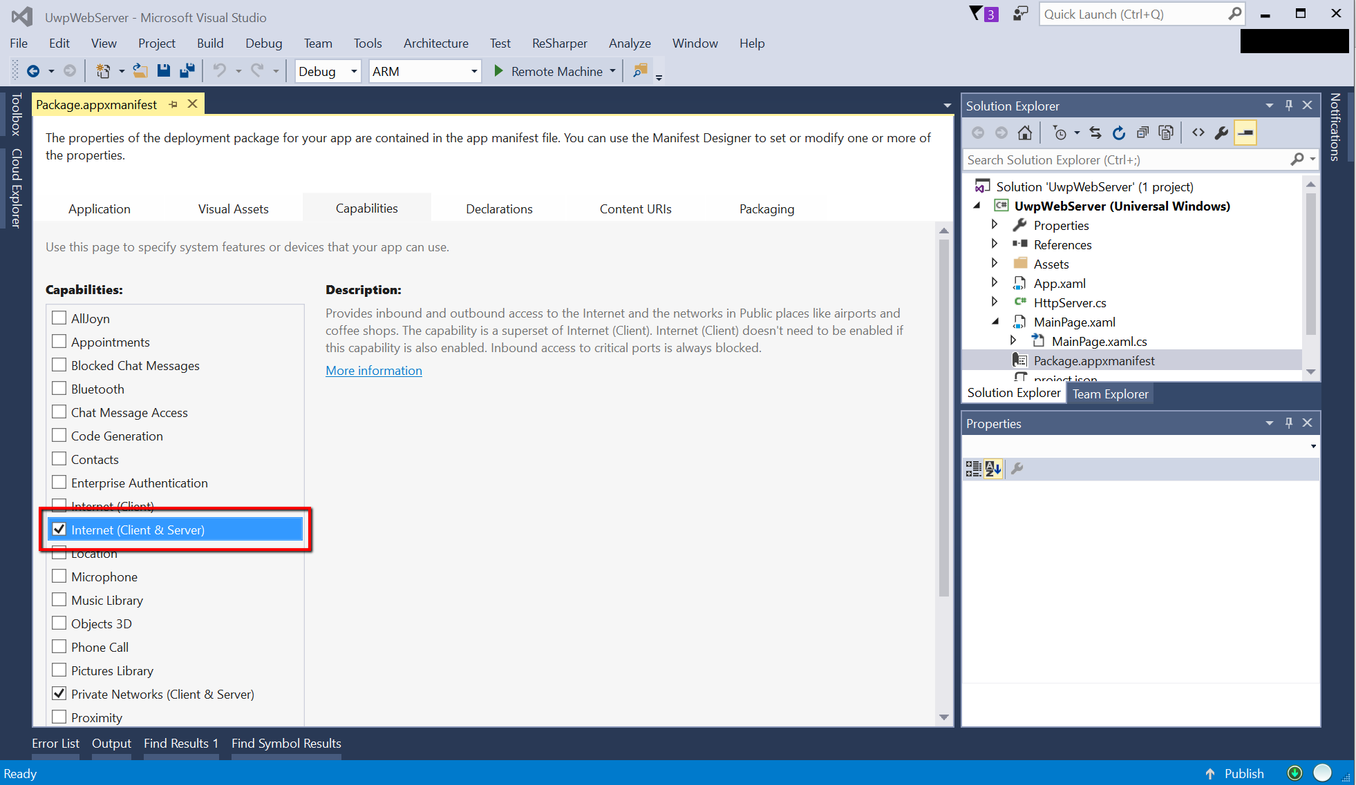 确保您在应用程序清单中选择了"Internet (Client & Server)“功能。您可以通过打开Package.appxmanifest文件并单击“功能”选项卡找到此设置。
