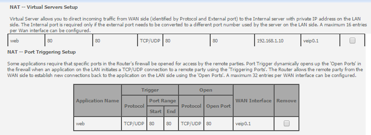 问题出在我的路由器设置上。我有两个NAT选项(Virtual安装程序和端口触发安装程序),我的设置如下: