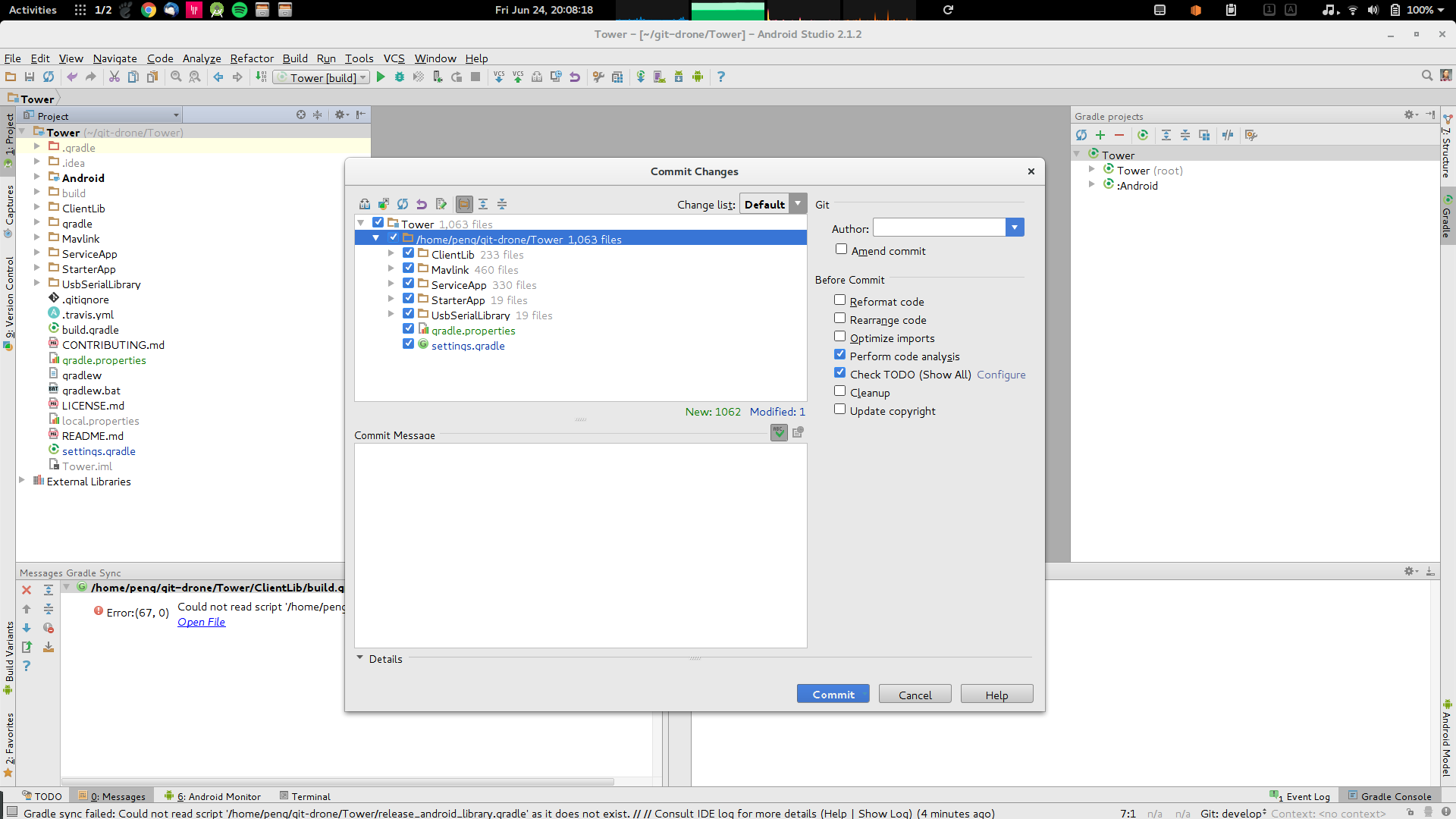 然而,Android做了一些非常不寻常的事情,即它总是将其他项目的所有源代码复制到当前项目的根目录中。如下面的截图所示,显示在diff窗口中的所有文件夹都会被从dronekit安道尔复制到Tower。