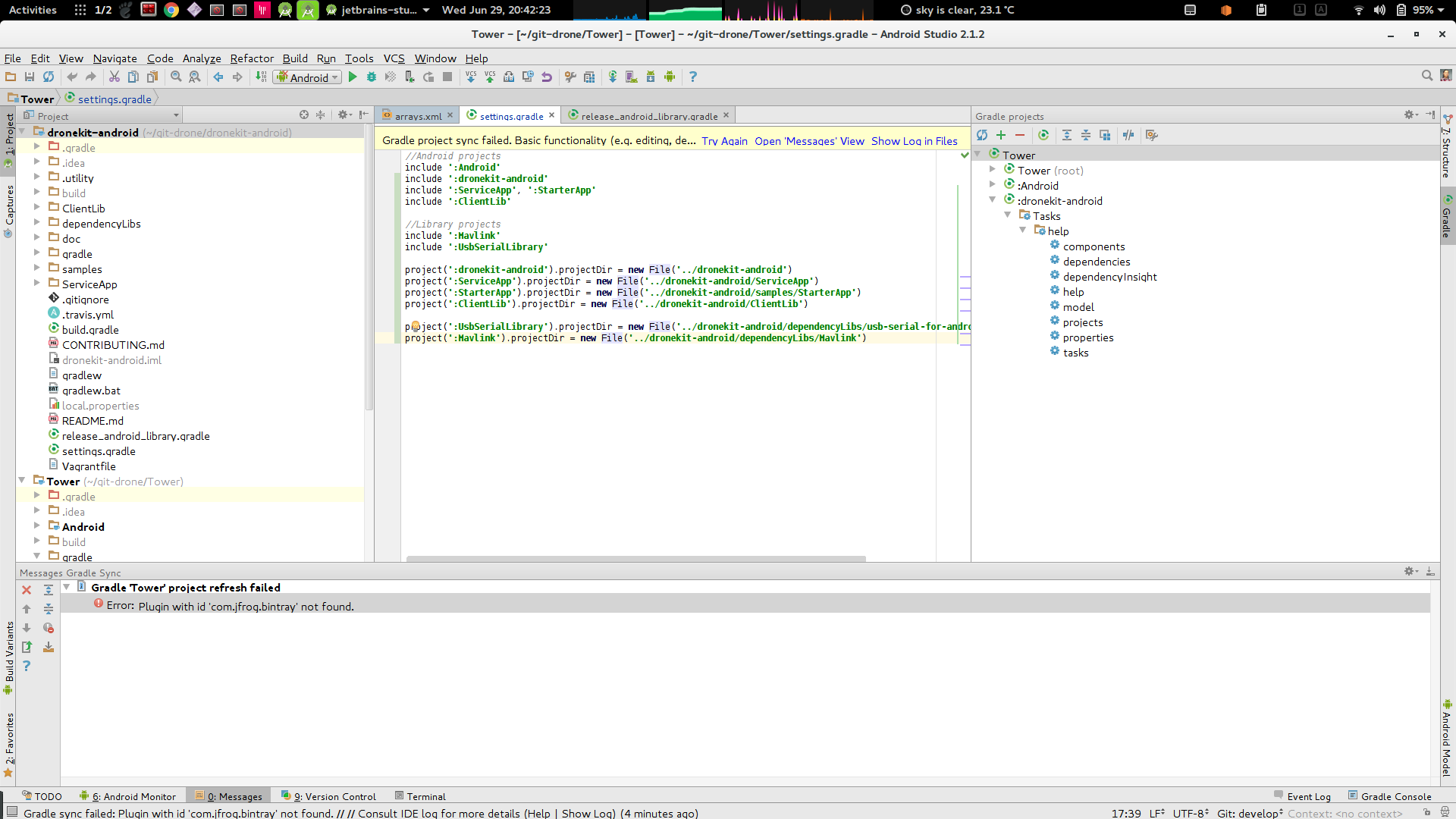 project(':dronekit-android').projectDir = new File('/home/peng/git-drone/dronekit-android')但是由于这个错误,我无法导入它: