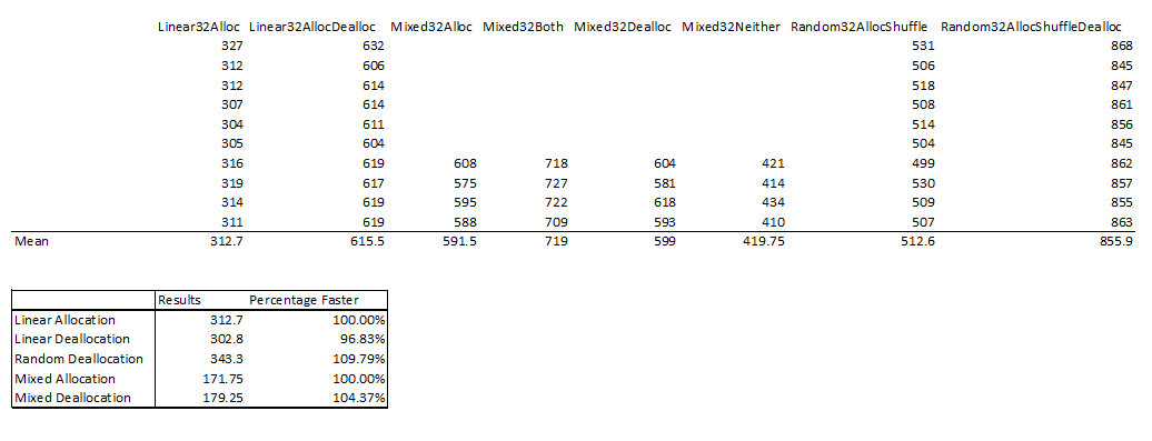 关于分配内存比释放内存更快的断言对我来说有点奇怪,所以我对它进行了测试。我运行了一个测试,我在32字节块中分配了64 it的内存(对new的调用为200万次),并尝试以与分配的顺序相同的顺序删除该内存。我发现线性序去分配比分配快3%左右,随机去分配比线性分配慢10%左右。