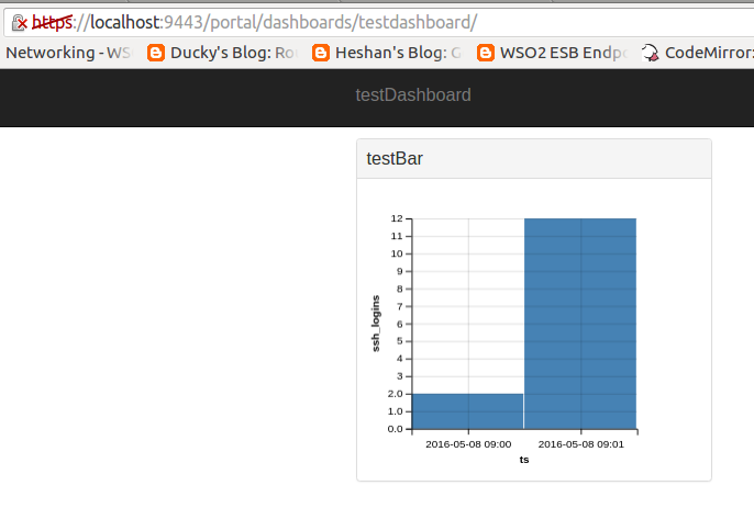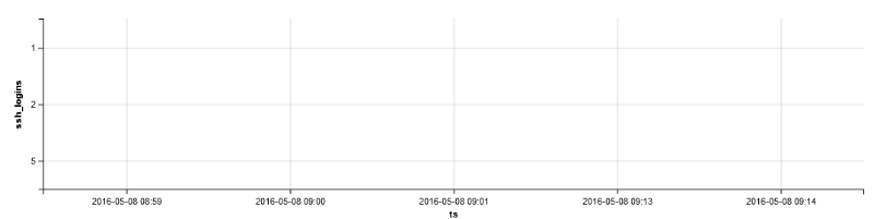 2016-05-08 09:14 20其中ts是字符串,我需要将其设置为x轴,而ssh_logins是要被选择为y轴的长变量。现在,当我选择一个line chart时,我无法得到一个图,因为它不允许选择字符串作为x轴。如何克服这一问题?我也尝试过bar-chart,但是当数据出现时,没有填充条形图。下面是要演示的图像。是否有方法使用wso2cep dashboard中可用的小工具来绘制这些简单的值?