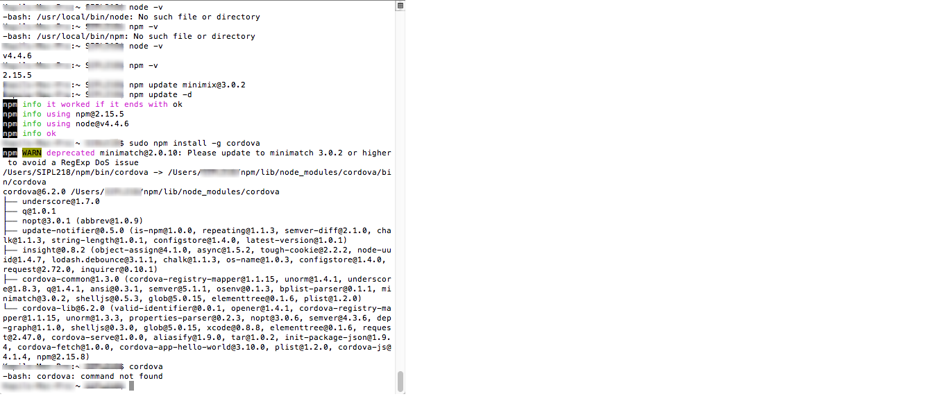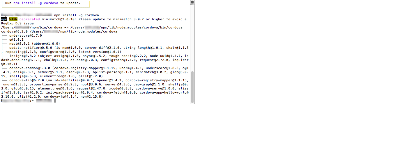 看起来像npm@2.15.8,它列在两个cordova包中,它依赖于节点-gyp@3.3.1,它依赖于minimatch@2.0.10。