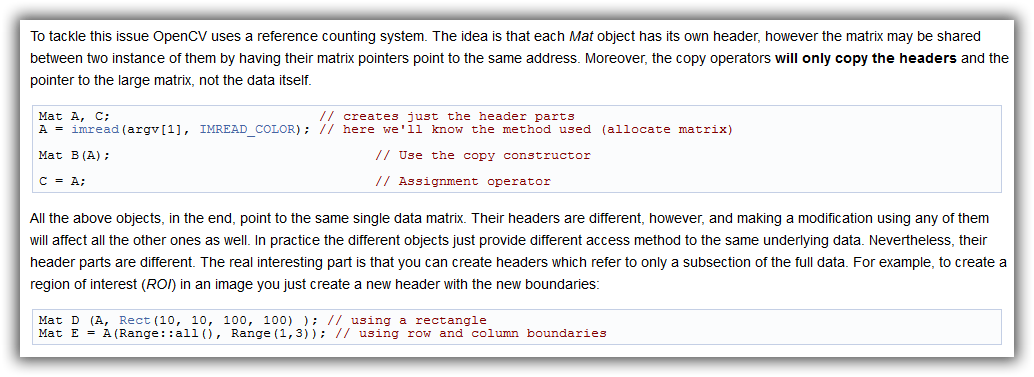 对于信息,OpenCV使用cv::Mat的引用计数机制,赋值操作符只需创建对现有数据的新引用。如果您想要创建cv::Mat的真正的深拷贝,则需要使用cv::Mat::clone()。