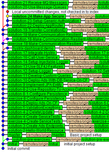 正如您所看到的,我们有几个分支,其中大多数是solution-xyz-foo,用于表示不同的数字xyz。solution-12构建在solution-11上,等等。也有一些偏离这一规则,例如分支hystrix-dashboard-demo。