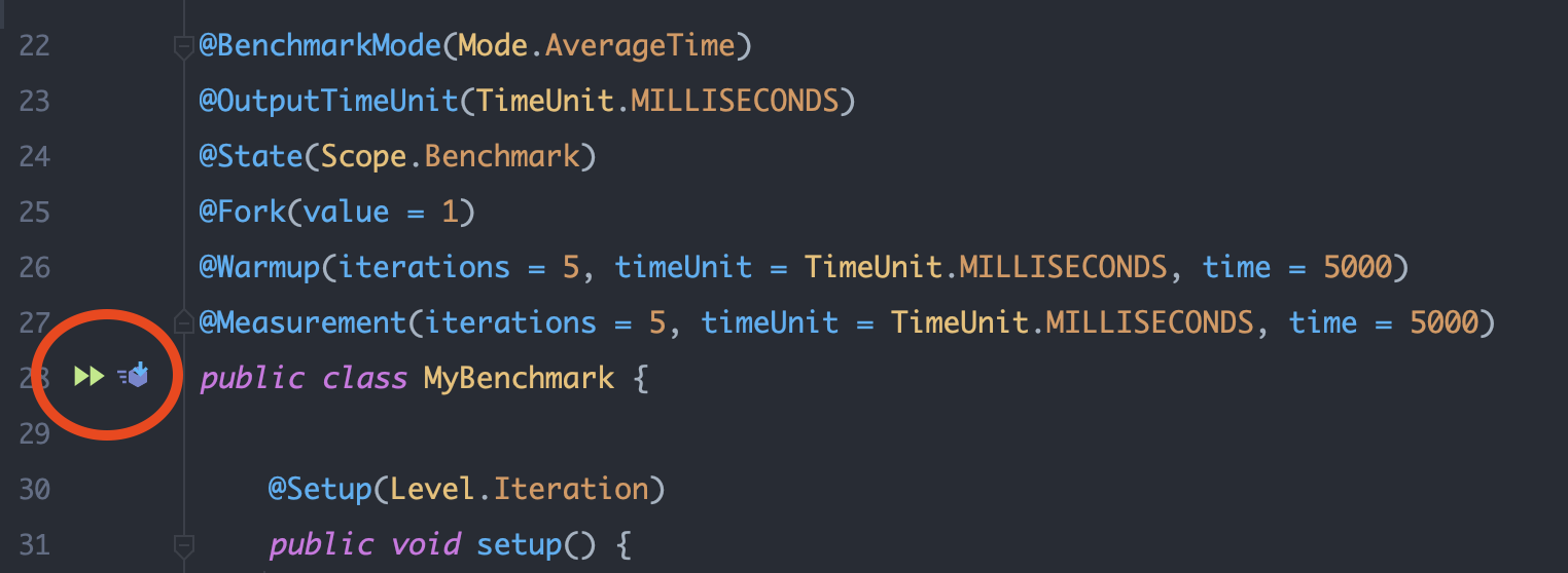 如果您使用的是IntelliJ,请从Preferences > Plugins部分安装Java微带基准插件,然后可以完全省略main方法,IntelliJ将在类名旁边提供一个run按钮: