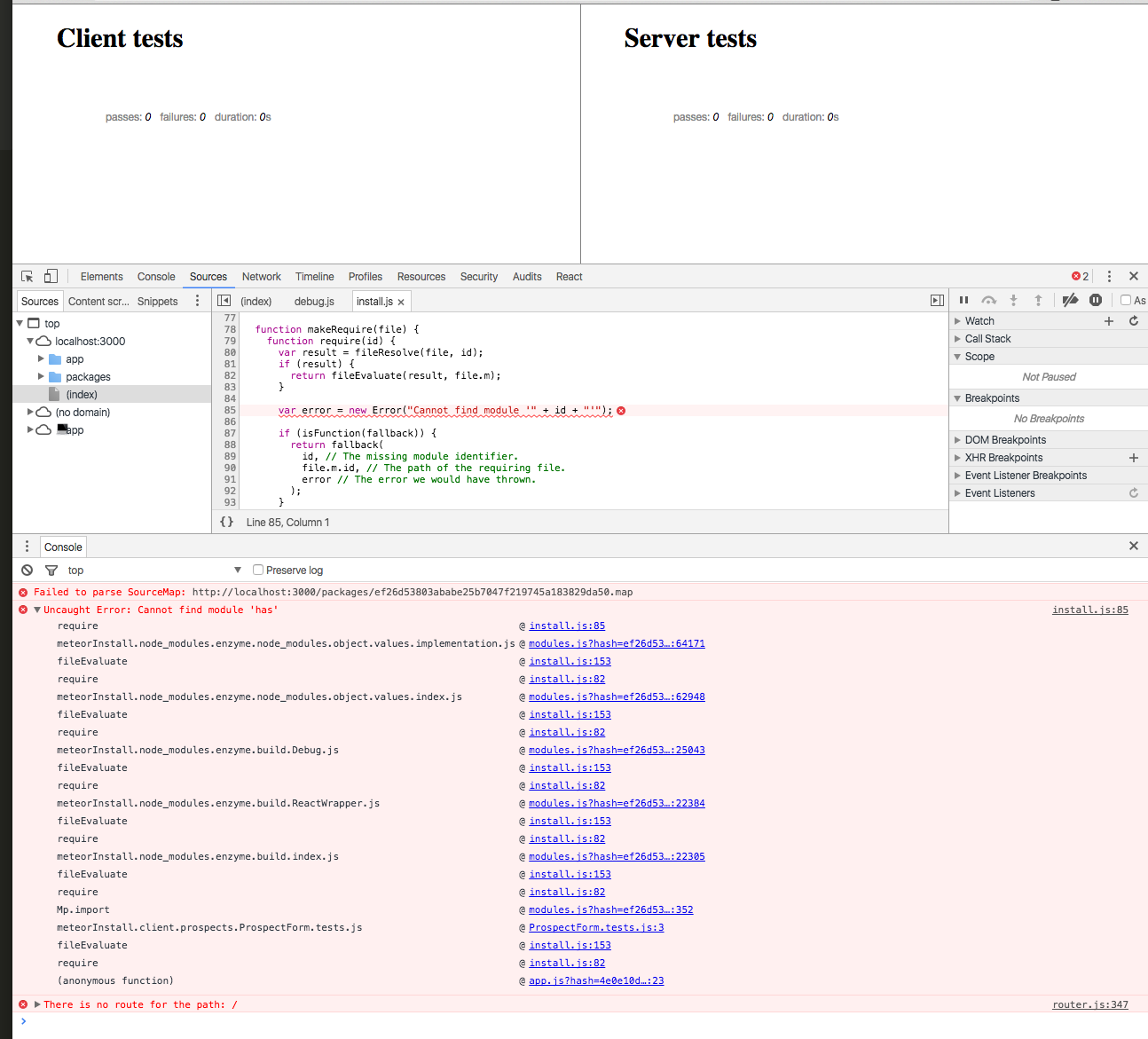 找不到模块'has‘。看起来问题源于酶,但当我创建一个新的流星应用程序,添加酶和实际流星:摩卡,然后添加同样的测试,它的工作很好,所以它必须与我的环境在这个应用程序。