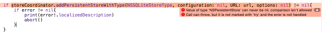 类型'NSPersistentStore‘的值永远不可能为零,不允许进行比较 调用可以抛出,但它没有被标记为“try”,错误也不会被处理。