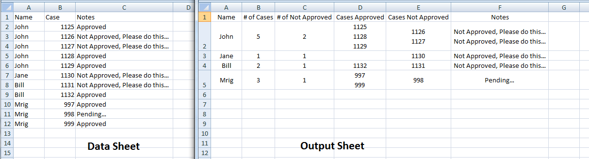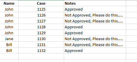 'for each unique name get the values of case and notes