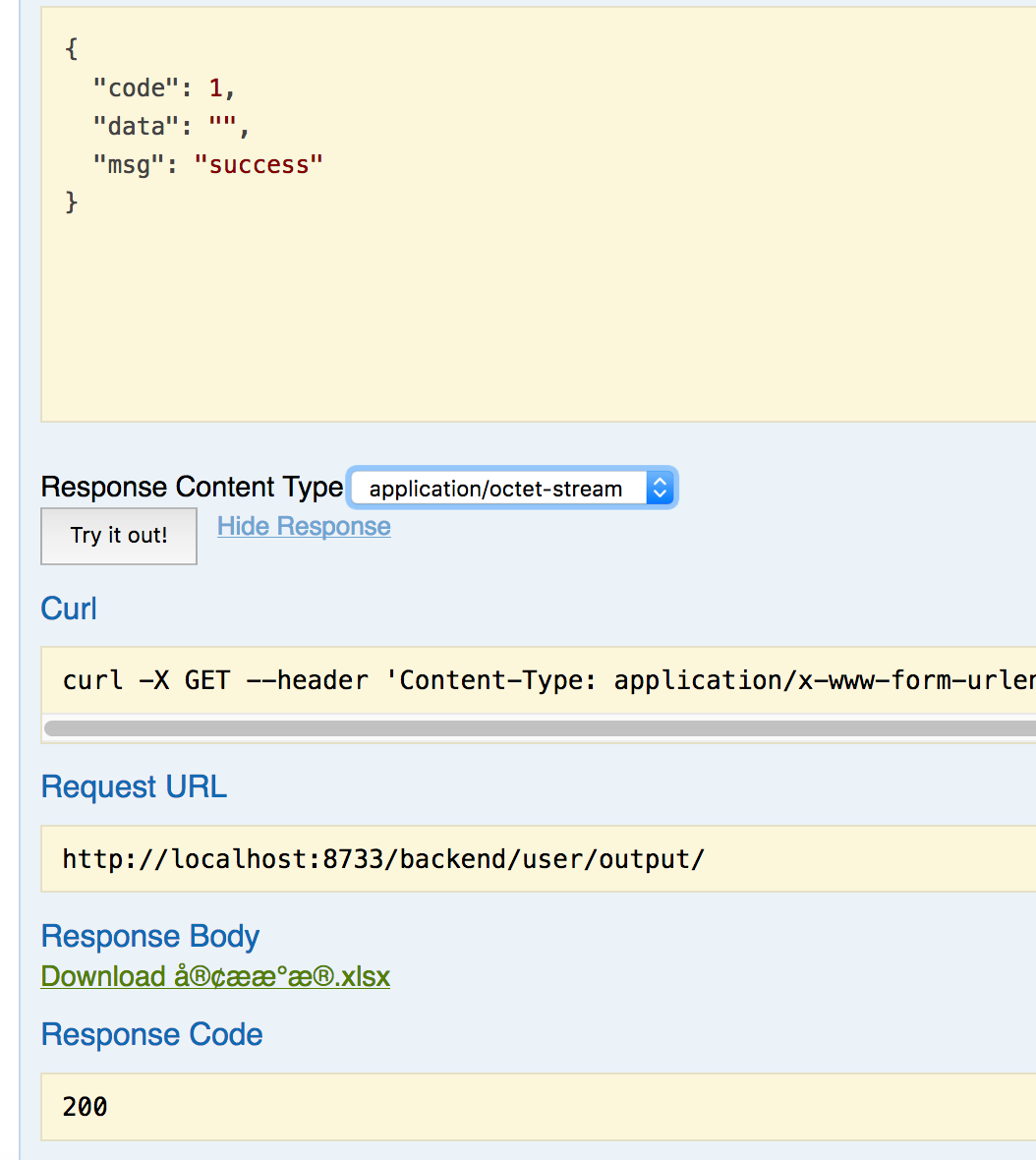 尝试使用flasgger下载excel。您可以将响应类型更改为“应用程序/八位元流”来解析它。