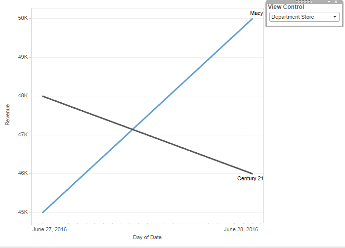 ...我想用线条图来研究收入。所以我使用Date作为水平轴,Revenue作为度量,而Store Name作为颜色维数。因此,它将呈现几个颜色线,以获取收入的日期。