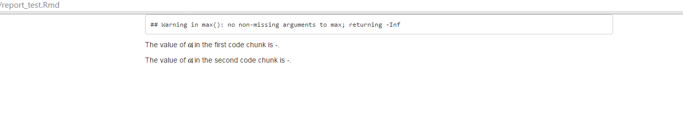 第一个警告没有被抑制,第二个是由include=FALSE发出的。然而,warnings=FALSE一直致力于抑制其他警告,如包命名空间冲突。