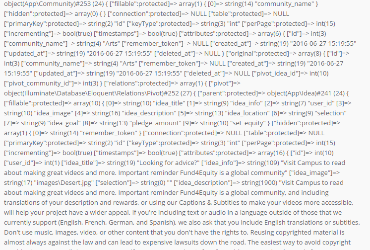 当您执行$ideas = Idea::paginate(15);时,您将得到一个具有许多模型的分页器,比如一个集合,因此您不能执行$ideas->communities。你必须循环所有的想法,然后得到每一个社区。