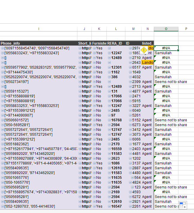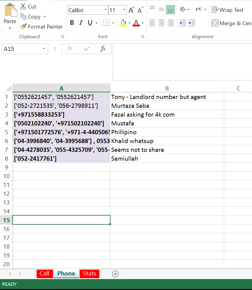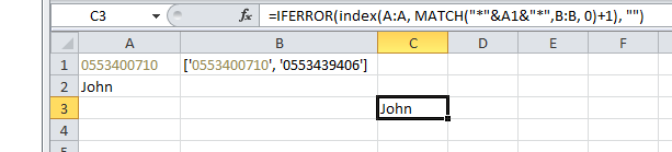 ['number','number,'number',...... ]我想在细胞A1中匹配0553400710,在单元B1中匹配'0553400710','0553439406‘。