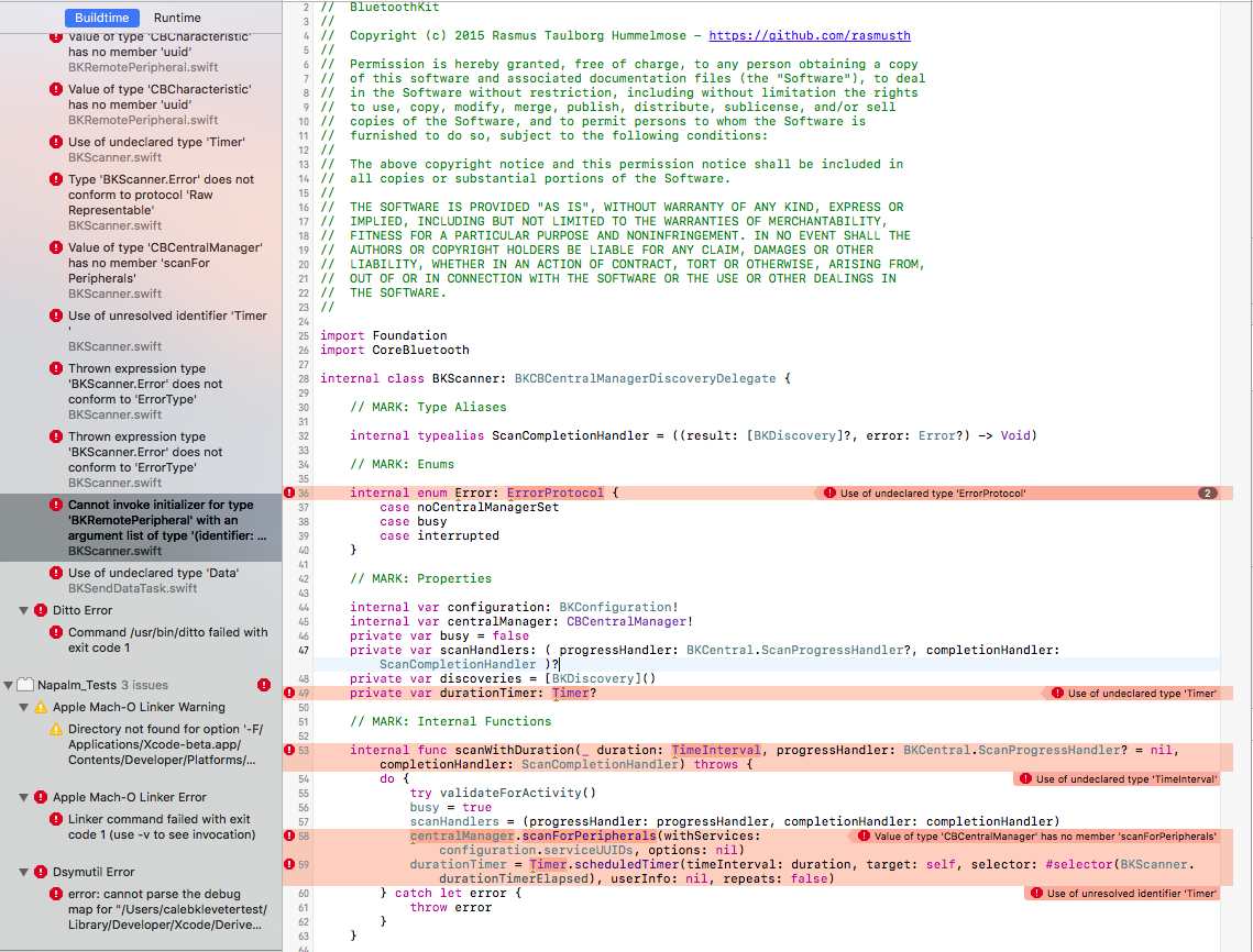 我想我知道问题出在哪里了。您已经直接将所有文件从Swift2.0转换为Swift3。这样不行的。我建议您删除这些pods并克隆Swift3分支的这 (我相信您正在使用),并复制源目录到您的项目,因为它没有说明哪个版本的回购是可用的swift-3。它应该能解决你的问题。:)