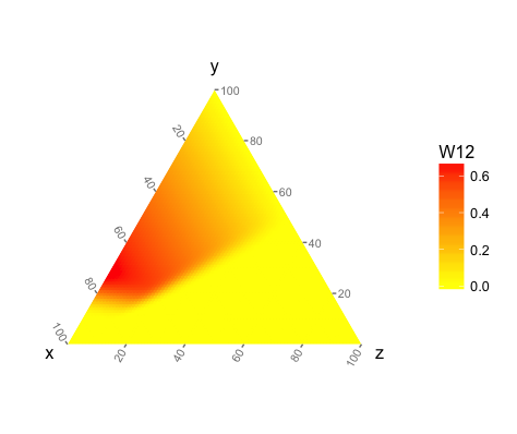 第二个图形是由一个第三方Matlab软件包ternplot生成的。我想要一个三元等高线图,它有离散的线条,而不是我的第一个图形中的热图。具体来说,我想指定一个轮廓线的列表,比如W12=0.05,0.1,0.15,...。我和geom_density_tern和geom_interpolate_tern一起玩了几个小时,但仍然不知道如何得到我想要的东西。