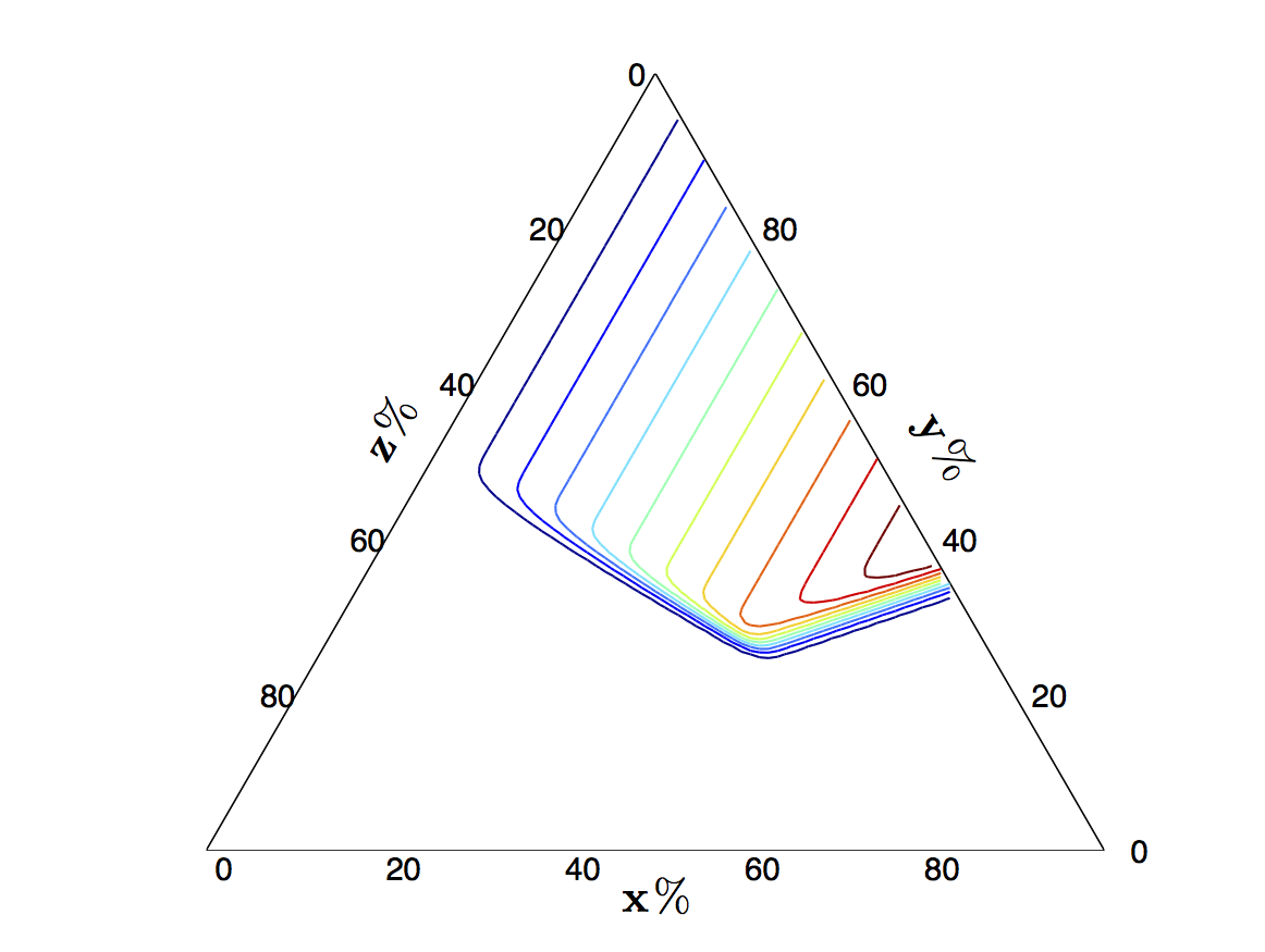 [HCl, Hha, cax] = terncontour(X,Y,1-X-Y,data,[0.01,0.1,0.2,0.3,0.4,0.5]); 其中,X,Y,1-X-Y指定绘图上的坐标,data存储值,向量指定等值线的值。