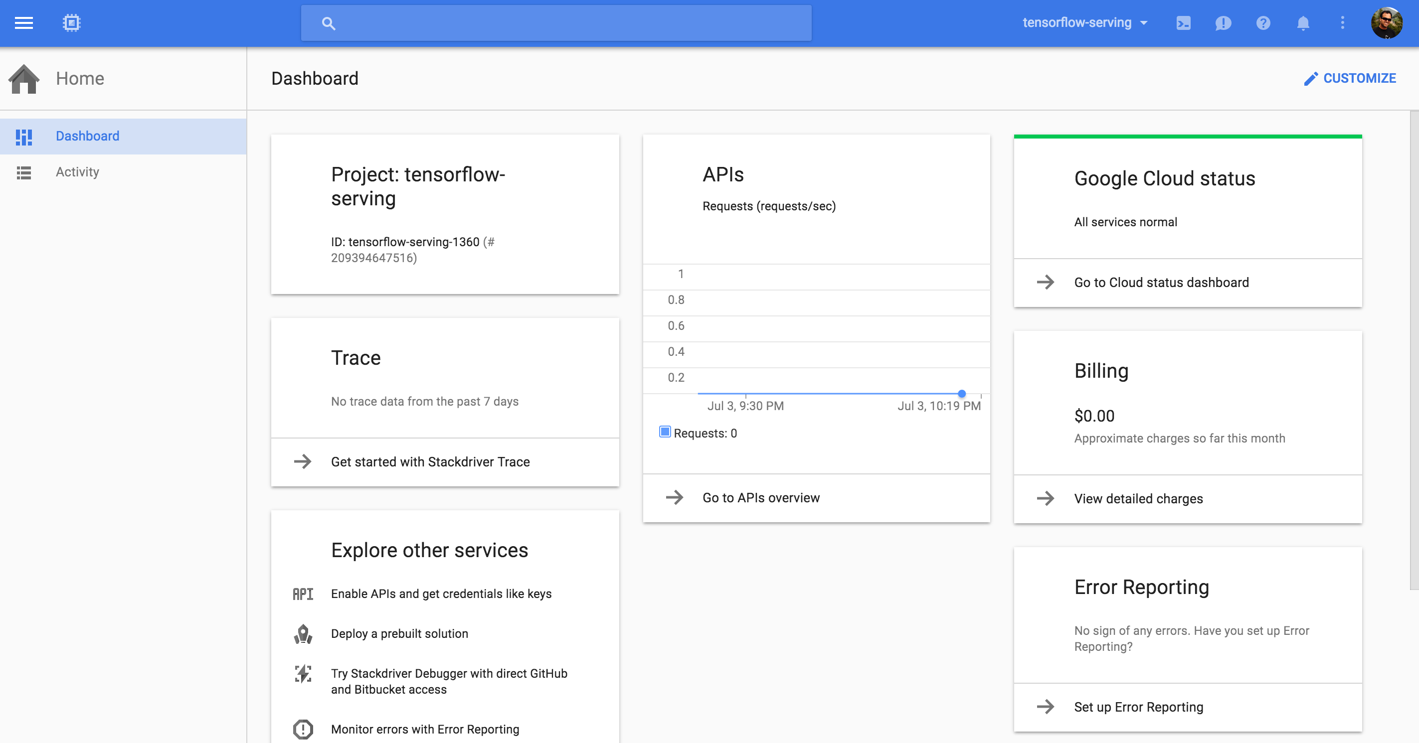 项目tensorflow-serving不属于您。它是链接教程中使用的示例项目名称,但您需要将其替换为您自己的项目的名称,如第2部分开头的行所述: