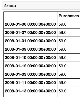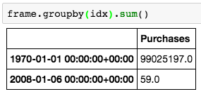 frame.groupby(idx).sum()然而,在这一点上,发生了一些奇怪的事情。这些日期最后按以下方式分组