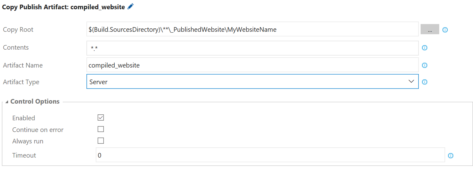 /p:PackageLocation="$(Build.BinariesDirectory)\Published"如果这样做,则需要将此目录配置为复制和发布任务中的复制根目录。