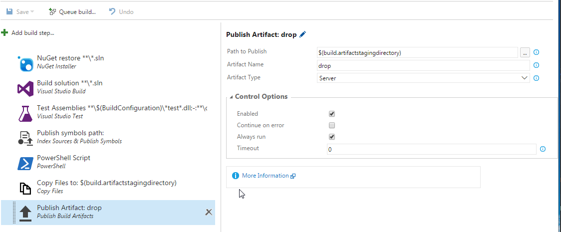 第二部分我可以自己解决,但是关于如何将编译好的源代码转储到git上,VSTeam的文档似乎很粗略。除了Powershell脚本,它应该为删除创建工件。之外,我将默认构建配置与默认版本几乎相同。尽管如此,drop.zip文件create仍然是空的。