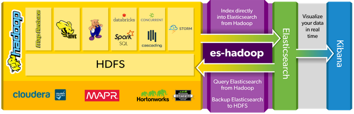 关于分析部分,我和我的团队正在比较Apache流和Apache,以便与Elasticsearch一起使用它。尽管Apache是一个真正的实时数据处理工具,比Apache流更快,但它并不提供像Apache这样的机器学习库。这就是为什么我们正在考虑选择Apache火花。弹性网站表明,它存在一个连接器ES-Hadoop来连接Elasticsearch数据库到Hadoop生态系统。我们可以从下图中看到这一点。