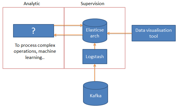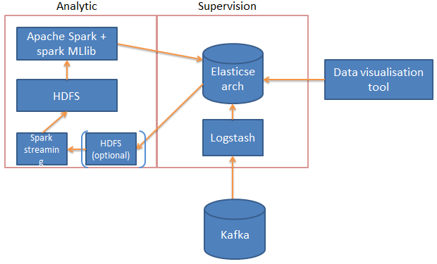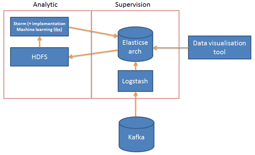 我们正在用开源工具构建一个实时的大数据工具。我们的主要目标是通过实时从kafka服务器获取日志来监控和分析网络。我们在教程中看到,我们必须将我们的工具分成两个部分:分析和监督,如下所示。
