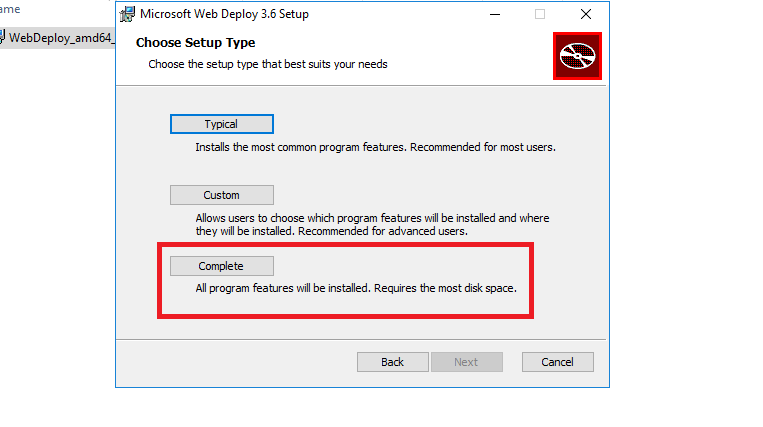 在windows服务器上安装web部署时,请确保选择“完成”功能安装,而不是“典型”或“自定义”。安装完成后,您将能够从visual studio部署应用程序。