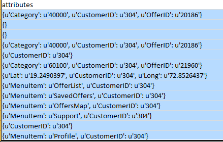 # process event dictionary要访问CustomerID、OfferID、Category等,您需要访问与event字典中的键'attributes'相关联的嵌套字典: