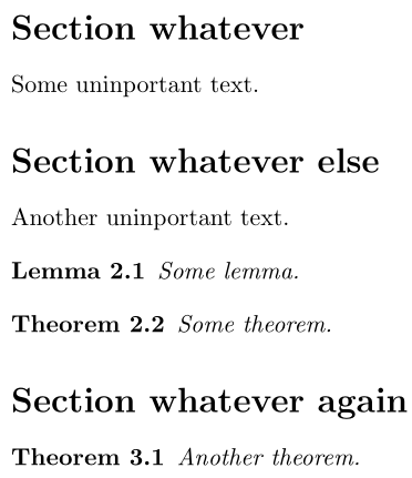 我对乳胶的编号有问题。我想从标题和内容中删除节号,但我希望这些数字存在于引理、定理等中。我希望它看起来像: