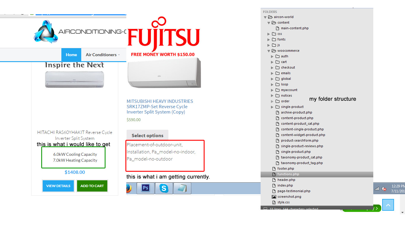 我想在分类页面上展示我的产品的两个属性,即加热能力和冷却能力,因为我在woocommerce制作一个在线商店,我正在使用我的定制主题。它不是一个变体或什么的,它只是一个文本的普通属性,我想显示类似于这的东西,因为您可以看到类别页面上列出的加热和冷却系统,我试过了代码