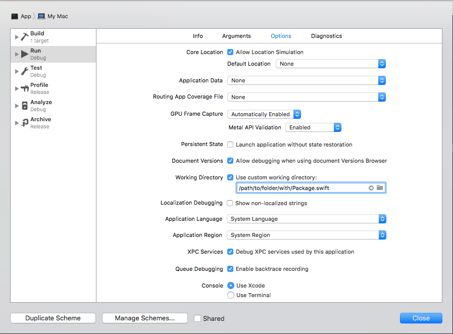 如果这不能正常工作,很可能您的工作目录配置不正确。如果您从Xcode运行项目,或者在命令行中从不是项目根目录的文件夹运行项目,则可能发生这种情况。