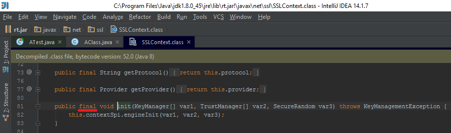 查看API接口并对抛出NPE的init方法进行反编译签名,它显示为final,它是basic Mockito.mock()无法处理。