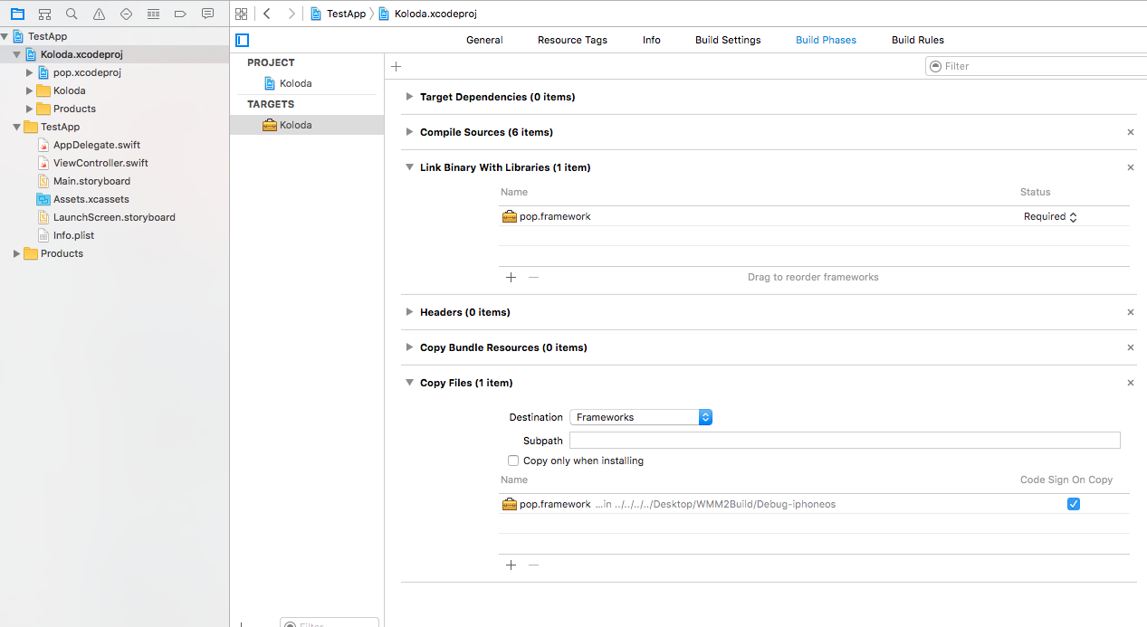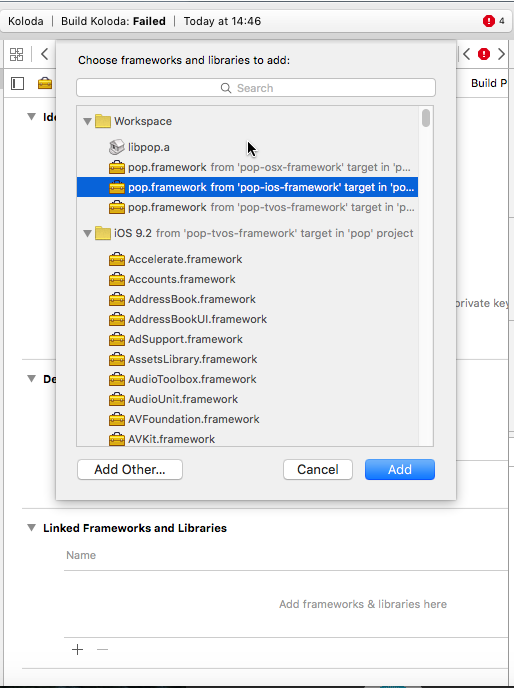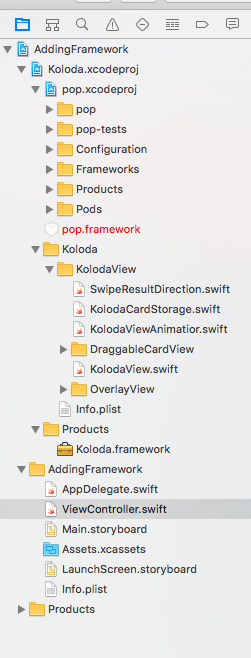 一旦将pop添加到Koloda,就可以将pop的iOS框架添加到Koloda中,它应该会出现在列表的顶端。Koloda项目编译吗?