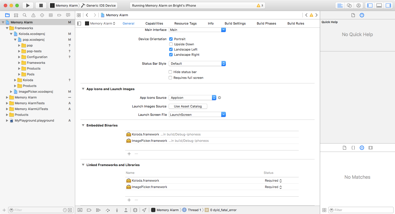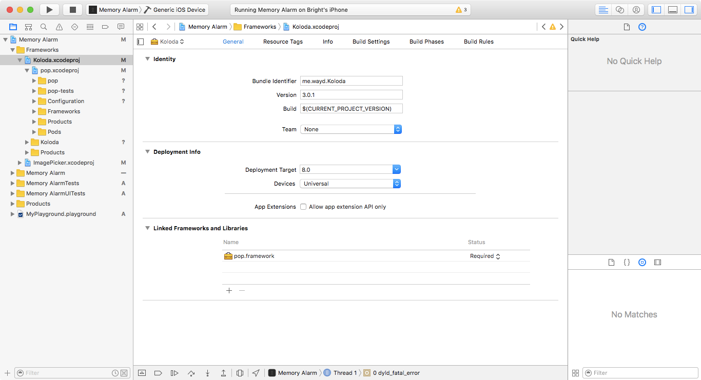 dyld:未加载库:@rpath/pop.framework/pop 参考资料: /private/var/containers/Bundle/Application/9FC4B4D6-35AE-4233-9873-13905A64F725/Memory Alarm.app/Framework/Koloda.framework/Koloda 原因:找不到图像
