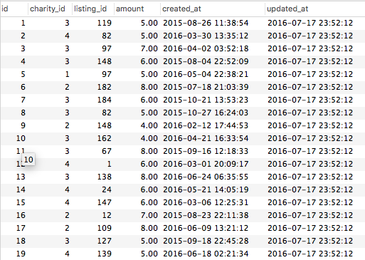 我有一张charity_donations桌子,里面有一张charity_id,为慈善事业捐赠的款项,以及其他领域的捐款。这就是它的样子。
