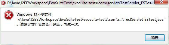 这些汉字的意思是“F:\Java\J2EEWorkspace\EvoSuiteTest\evosuite-tests\com\s...\TestServlet_ESTest.java 找不到这个文件 。请再试一次检查文件名。"。