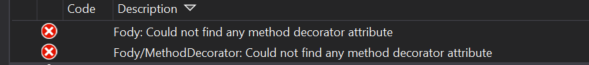 显然,MethodDecorator.Fody的最新版本(目前版本为0.9.0.6 )无法工作。将版本降级为0.8.1.1版本为我解决了这个问题。