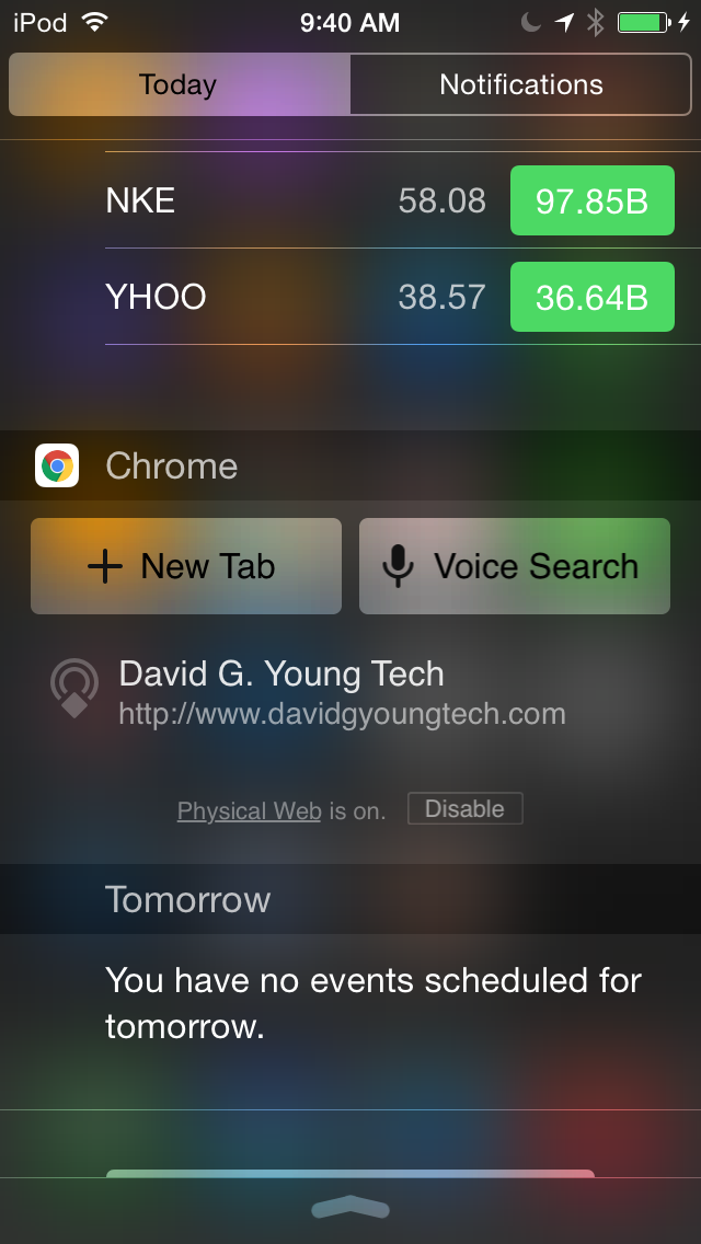 请理解,发送的Eddystone-URL不会自动导致接收设备上的通知,除非有一个应用程序来检测和显示URL。Chrome和Android (49+)会通知你“附近的物理网页”,点击它就会显示细节。