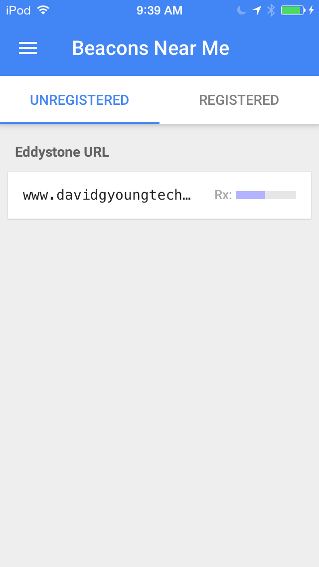 我已经成功地扫描了一个Eddystone-URL信标框架,在定位应用2.7.1版上做广告,并在BeaconTools应用程序中扫描它的iOS版本1.4,并使用Chrome 51.0.2704.104在iOS上使用Chrome小部件检测到它作为物理网络发射机。