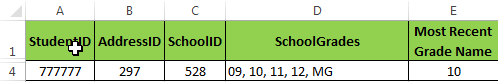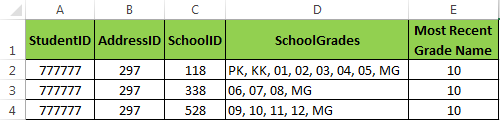 我正试图根据最近的年级栏来隔离学校的ID。这显示了学生被划分为哪所学校。我不知道如何根据列结果搜索字符串。隔离学校的最好方法是什么?