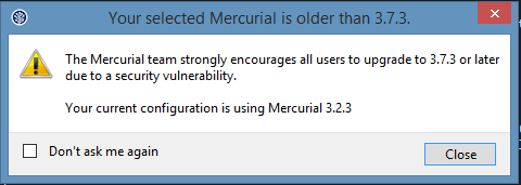 自从我升级到SourceTree 1.9.5.0以来,由于存在安全漏洞,经常会提醒我将Mercurial从3.2.3升级到3.7.3。我将在不久的将来这样做,但我有兴趣了解该漏洞的性质。
